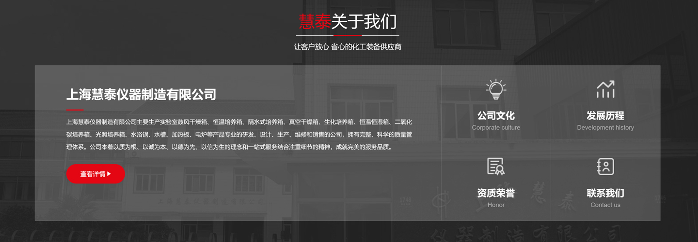 上海慧泰儀器制造有限公司主要生產(chǎn)實(shí)驗(yàn)室鼓風(fēng)干燥箱、恒溫培養(yǎng)箱、隔水式培養(yǎng)箱、真空干燥箱、生化培養(yǎng)箱、恒溫恒濕箱、二氧化碳培養(yǎng)箱、光照培養(yǎng)箱、水浴鍋、水槽、加熱板、電爐等產(chǎn)品專業(yè)的研發(fā)、設(shè)計(jì)、生產(chǎn)、維修和銷售的公司,擁有完整、科學(xué)的質(zhì)量管理體系。公司本著以質(zhì)為根、以誠(chéng)為本、以德為先、以信為生的理念和一站式服務(wù)結(jié)合注重細(xì)節(jié)的精神,成就完美的服務(wù)品質(zhì)。